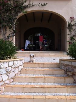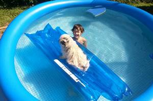 Aennie ist auch wieder vom Urlaub zurück und hat uns gleich besucht. Sie hat die Flugreise schon wie ein Profi gemeistert und die kleine Wasserratte hatte, wenn sie nicht mit den Jungs im Pool herumgepaddelt ist - ihren Lieblingsplatz auf der obersten Stufe - mit dem Bäuchlein im Wasser :-)