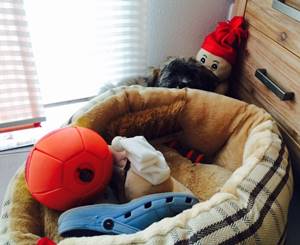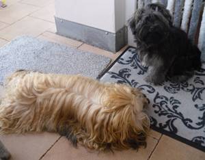 Boogie hat eine süße Freundin, Nele, mit der er wild getobt und heftig geschmust hat bis beide fix und alle waren und sich in aller Ruhe ein Knöchelchen geteilt haben.