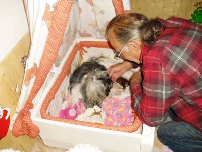Es gibt ja viele Welpen, die in tollen Welpenzimmern aufwachsen sogar mit Geräusch CD's und sowas. Bei uns sind sie vom ersten Tag an mitten im Leben in unserer Wohnküche. Erstens sind uns unsere Hunde so nah, dass auch unsere frischgebackenen Hundemamis, die eigentlich nur Interesse für ihre Welpen haben, nicht ohne uns sein wollen - auch in der Nacht. Sie müssen dann schon mal extra raus, weil sie ja viel trinken für die Milch und man hört halt einfach jedes Geräusch und ist sofort zur Stelle. Das hat sich, nur als kleines Beispiel, einmal wieder sooo bewährt: Um 2 hatte ich noch ins Betti geschaut (es brennt auch immer ein kleines Licht, damit unsere Mami was sieht nachts), und irgendwie bin ich dann doch eingeschlafen. Auf einmal wurde ich um halb 3, noch bevor ich selbst etwas gehört hatte, ganz aufgeregt von Mancy geweckt. Ich dachte Mancy muss raus, aber nein!!! Sie wollte nicht zur Terrassentür, sondern führte mich ganz aufgeregt zum Welpenbett. Da lag doch tatsächlich ein kleiner Schatz vor dem Bett auf dem Boden und jammerte ........ Und die grade stillende Mami schaute ganz verdutzt. An dem Bettchen war für den Anfang nur die niedrige Abgrenzung am Ausgang angebracht. Irgendwie muss der kleine Schatz, als die Mami eifrig den Popo geputzt hat, drüber gerutscht sein. Schnell wieder ins Bettchen zur Mami gelegt und alles war wieder gut - danke Mancy !!! So etwas treibt einem Tränchen ins Auge - so stolz auf die fürsorgliche Maus.