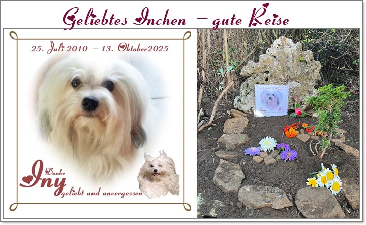verschwindet sie schon mal. Iny bleibt auch problemlos alleine, aber nicht gern. Am liebsten ist sie überall dabei und stundenlange Autofahrten - kein Problem- es braucht nur das Wort "Autofahren" zu fallen, da steht sie schon an der Tür. "Da soll der Hundetrainer noch mal behaupten Hunde verstehen kein DEUTSCH!" Iny hat uns wundervolle Welpen geschenkt und war eine phantastische Mutter, die ihre Welpen sehr instinktsicher, gewissenhaft und liebevoll erzogen und aufgezogen hat. Inchen ist im Ruhestand und wird uns bei der Aufzucht der kommenden Würfe immer eine wertvolle Unterstützung bei der Erziehung und Sozialisierung der Welpen sein.